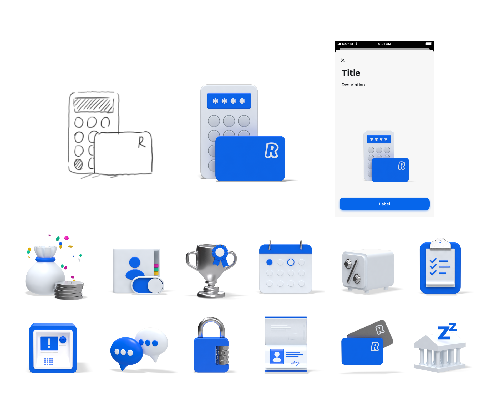Functional icons are the most handy 3D units since their models are the base of Revolut 3D assets library and could be used for other 3D compositions.